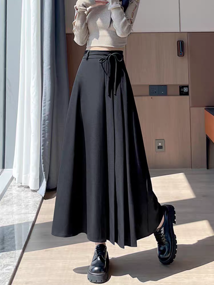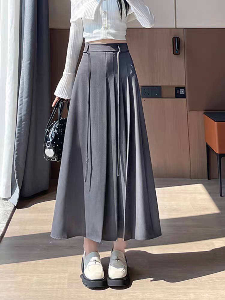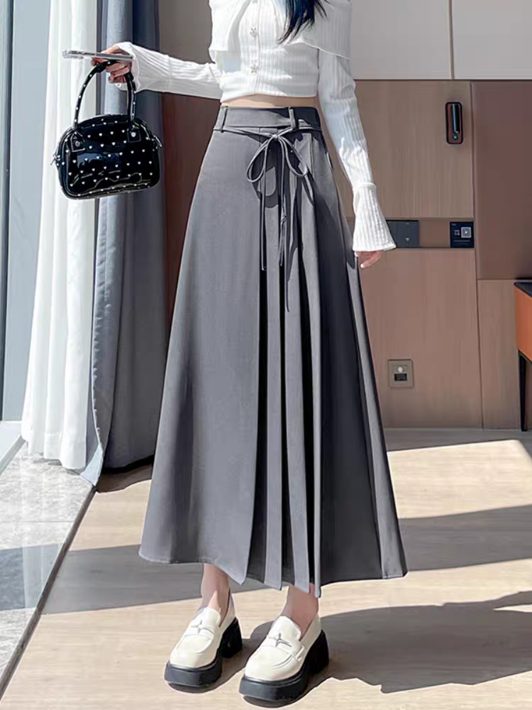 تنورة بدلة غير متماثلة لخريف 2025 تنانير طويلة ذات ثنيات رمادية عالية الخصر على شكل حرف A للنساء